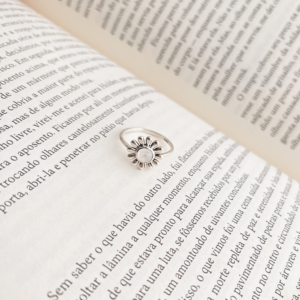 Experimente o charme do Anel Flor de Margarida com Pedra da Lua e deixe suas mãos brilharem com elegância!