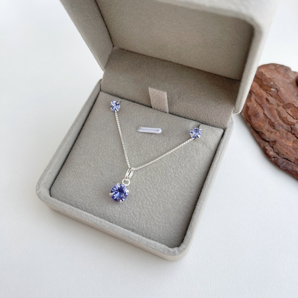 Beleza atemporal com um toque de cor. Brincos e colar com pedras de zircônia na tonalidade ametista, que trazem leveza e sofisticação à composição.