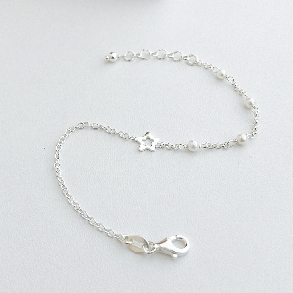 Pulseira infantil em prata de Lei 925 com estrela e pérolas.